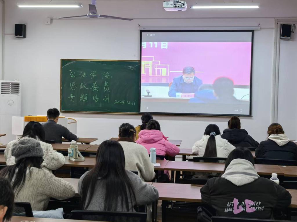 为深入学习和贯彻党的最新理论成果,进一步加强和改进公法学院班级思政工作,提升班级思政委员的专业素养和综合能力,公法学院习研会于2024年12月11日在公法楼205教室组织开展了思政委员专题培训。本次培训以观看直播的形式展开,特别邀请公法学院团学工作负责人钱前、23级学生辅导员朱玲、22级学生辅导员陈云和各班级思政委员共同参加。习研会负责人任逸鸣主持本次培训讲座。
