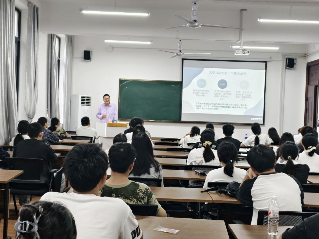 讲座中,邢维迢围绕新生常见的适应性问题,与同学们进行了深入互动,了解了大家在学习和生活方面的困惑。他结合真实案例,从心理调适、目标规划等多个角度进行了细致讲解,并分享了实用的自我调节方法,以帮助新生提升适应能力。在随后的互动答疑环节,同学们踊跃提问,就学业压力、人际关系等话题与邢维迢进行了热烈交流。邢维迢耐心解答,并鼓励大家主动构建自己的支持系统,遇到困难时及时向辅导员和心理老师寻求帮助。