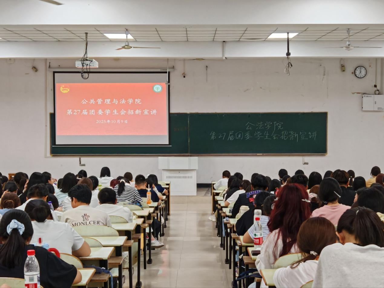 新的学期,新的征程,部门人才招募令正式启动!部门招新,既是为团队吸纳人才、优化架构以更好服务同学、推动校园文化建设,也为学生提供了实践平台,助力其提升综合能力。为实现这些目的,10月9日晚,公共管理与法学院在教三南203教室举办了2025级新生部门宣讲大会。学院各部门负责人、工作人员及全体2025级新生参加了此次宣讲活动。