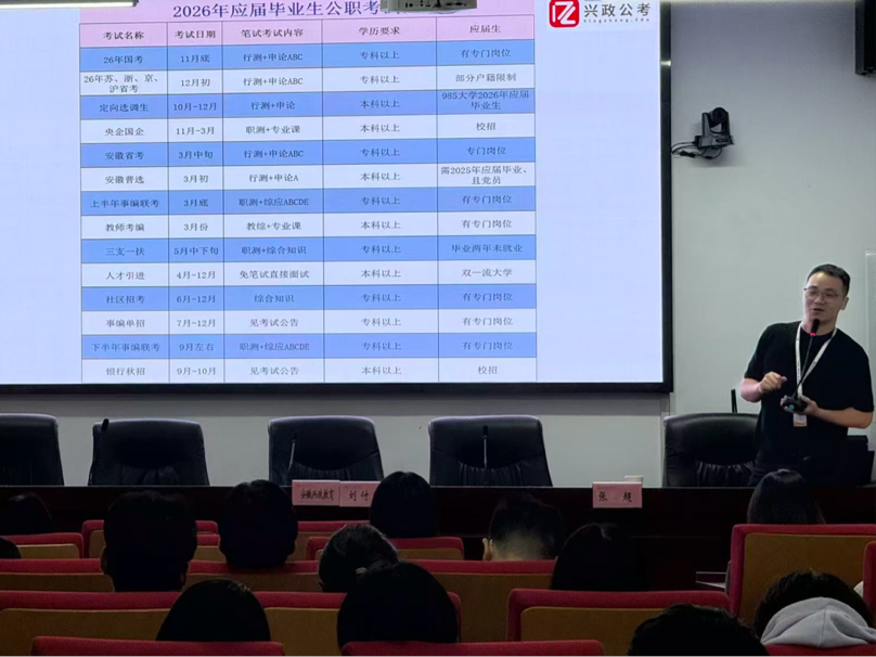 为帮助公法学子深入了解国家公务员考试、科学规划备考路径、提升就业竞争力,2025年10月17日,公共管理与法学院于佳山校区特邀“安徽兴政公考”举办国考备考宣讲会,公共管理与法学院党委副书记、纪委书记、学工副院长周浩然,辅导员产兵华,安徽兴政教育创始人刘付忠校长,安徽兴政公考机构笔试院长张超出席活动。