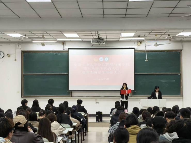 2025年11月9日,公共管理与法学院在佳山校区教三南201教室召开安徽工业大学公共管理与法学院第九次学生代表大会暨第五次研究生全体大会,院团学工作负责人钱前,各级团学组织学生代表和全体研究生等200余人参加。