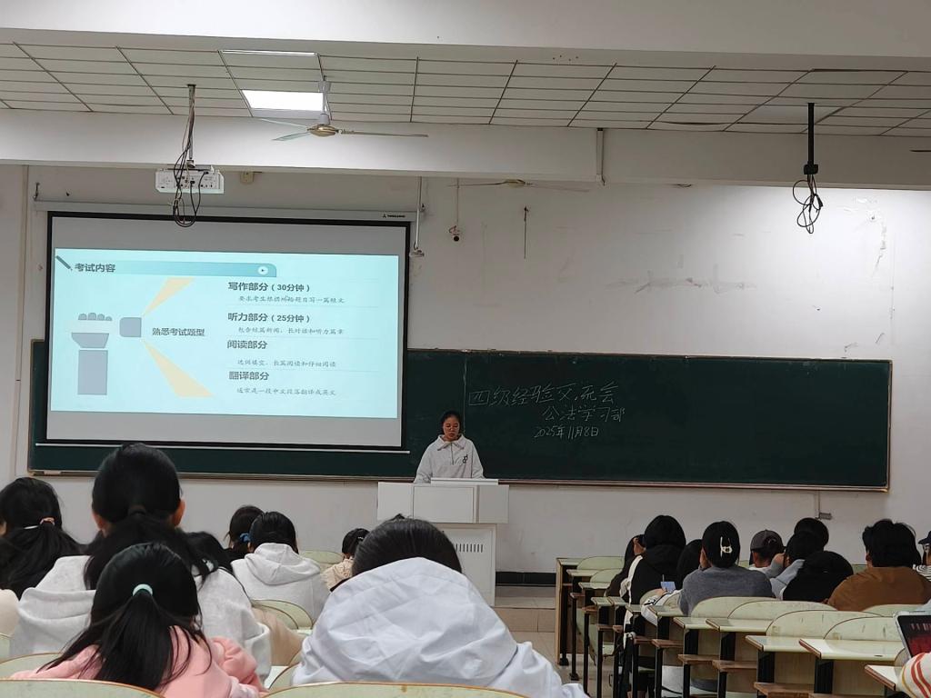 为了帮助同学们更好地备考英语四级考试,缓解考前紧张心态,提升英语水平,公共管理与法学院学习部于11月8日晚在第三教学楼南203教室开展四六级经验分享活动。此次活动特别邀请了程朵朵、梅啸云、江晨曦、宋子怡、陈志祥和高钰多位优秀公法学子来分享自己的备考经验和应试技巧。