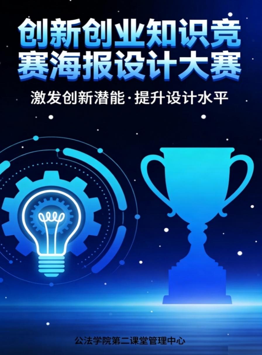 为丰富校园文化生活,激发学子创新创业热情,夯实第二课堂育人实效,公法学院第二课堂管理中心于2025年12月5日举办“二课创新创业知识竞赛海报设计大赛”。本次大赛以“传播创新理念,彰显法治青年风采”为核心,面向全院学生征集兼具思想性、艺术性与传播力的海报作品,吸引了众多热爱设计、关注创新的学子踊跃参与。
