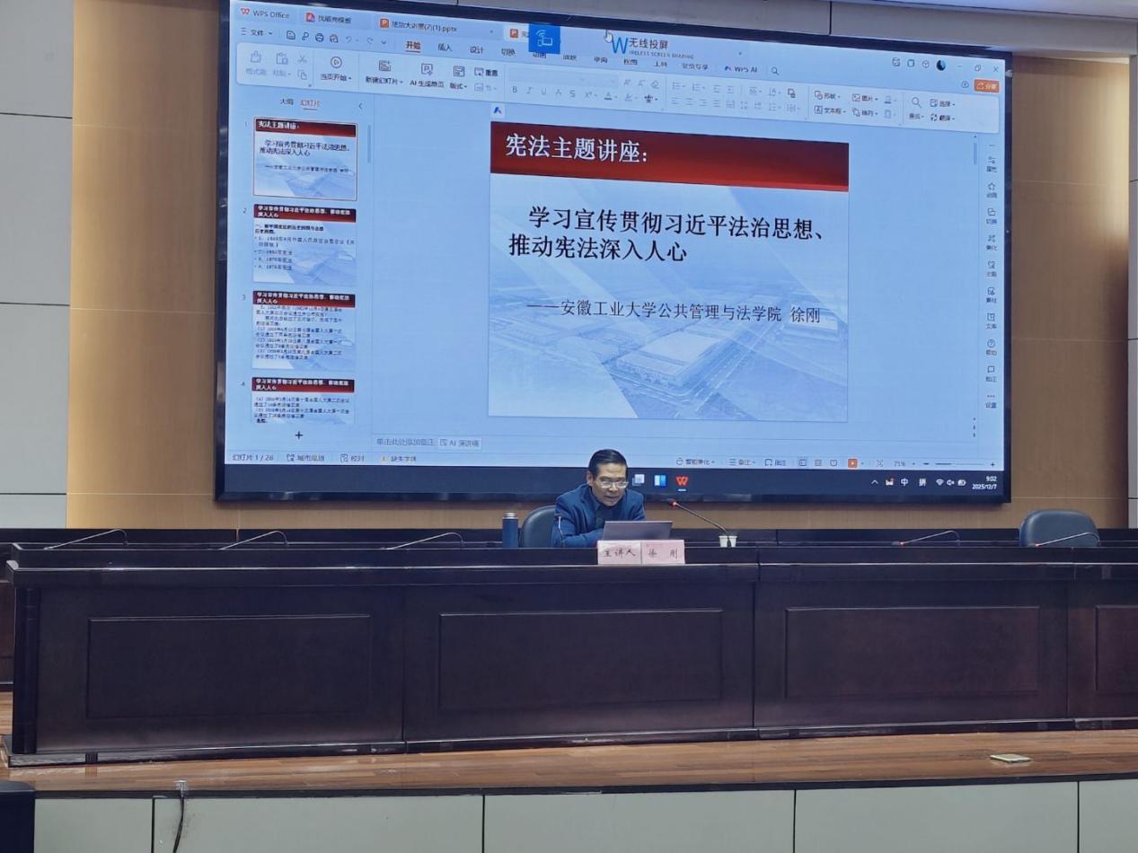 为深入学习宣传贯彻习近平法治思想,切实提升师生提高法治素养,弘扬宪法精神。由共青团安徽工业大学委员会主办,公共管理与法学院承办的“法治大讲堂”活动于12月7日在佳山校区学术会议中心开展。本次活动邀请公共管理与法学院副教授徐刚担任主讲人,公法学院团委书记钱前主持,为在场学子带来了一场兼具理论深度和实践温度的宪法知识普及课。