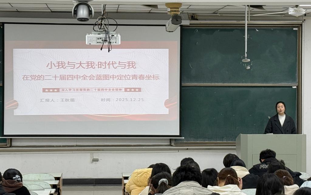 为深入学习贯彻党的二十届四中全会精神,引导青年学生在国家发展蓝图中找准青春坐标,厘清小我与大我、时代与自我的关系,将个人理想融入国家发展大局,公共管理与法学院于2025年12月25日晚在教三南401教室开展“小我与大我·时代与我:在党的二十届四中全会蓝图中定位青春坐标”主题宣讲活动。理论宣讲会由辅导员王秋丽主持宣讲,2025级全体新生参加。