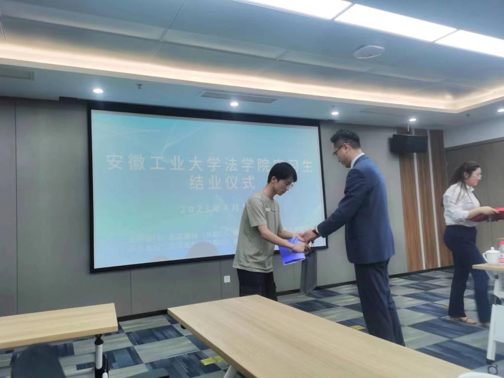2023年4月18日安徽工业大学公共管理与法学院法学系法学专业本科毕业班9名同学顺利结束了在北京盈科(马鞍山)律师事务所为期一个月的毕业实习。盈科(马鞍山)律师事务所为此专门组织了一次结业仪式,并为学生们颁发了结业证书与结业礼。北京盈科(马鞍山)律师事务所管委会副主任、行业导师姜海平主持人结业仪式。盈科所党支部书记魏广金等领导及指导老师、安徽工业大学公共管理与法学院法学系主任徐刚、党支部书记戚枝淬应邀参加了结业仪式。仪式上,盈科所指导老师代表及实习学生代表分别进行了发言。结业仪式上双方还就加强进一步深化校企合作进行了交流。
