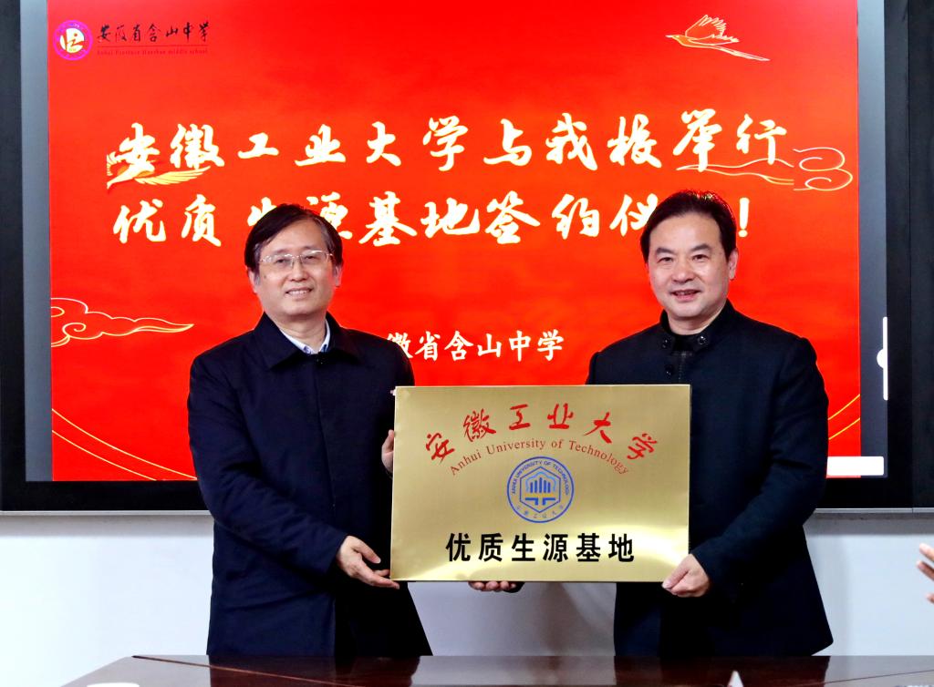 魏先文代表学校向含山中学授予“安徽工业大学优质生源基地”牌匾,与含山中学签署了优质生源基地建设合作协议,送上2021-2022学年度我校含山中学校友喜报。