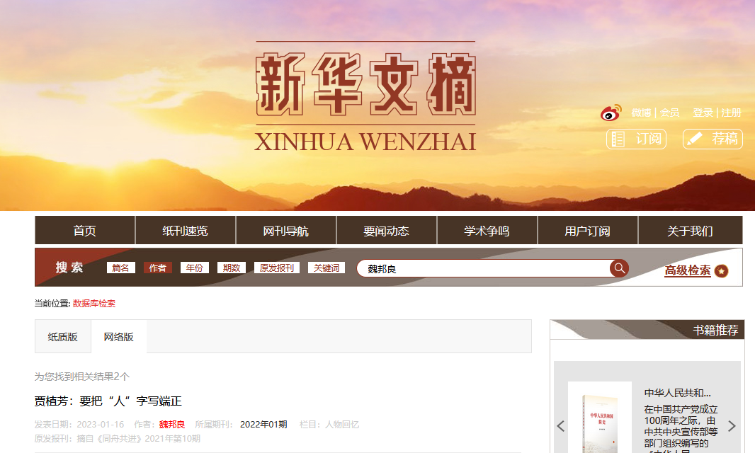 《新华文摘》(网络版)2023年1月6日全文转载我院魏邦良教授的《贾植芳:要把“人”字写端正》一文。该文曾发表在《同舟共济》2021年第10期。另魏邦良教授的《李叔同和他的老师们》一文曾被《新华文摘》(网络版)2018年第8期全文转载。