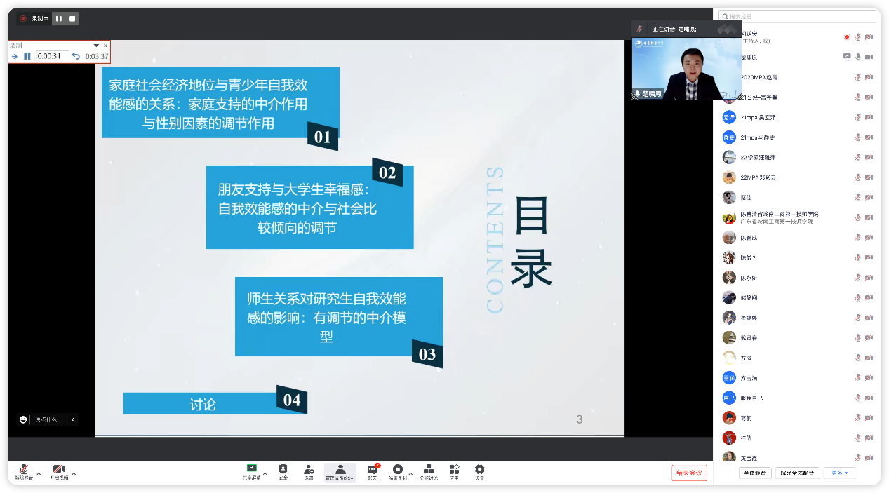报告开始前,问老师对楚老师的到来表示热烈欢迎并简要介绍楚老师的基本情况。楚老师通过自己的三篇高水平论文展开报告内容,分别是《家庭社会经济地位与青少年自我效能感的关系:家庭支持的中介作用与性别因素的调节作用》、《朋友支持与大学生幸福感:自我效能感的中介与社会比较倾向的调节》和《师生关系对研究生自我效能感的影响:有调节的中介模型》。他从研究的理论基础切入,帮助同学们理解研究变量之间的关系,亦为同学们后续的论文写作拓宽了思路。