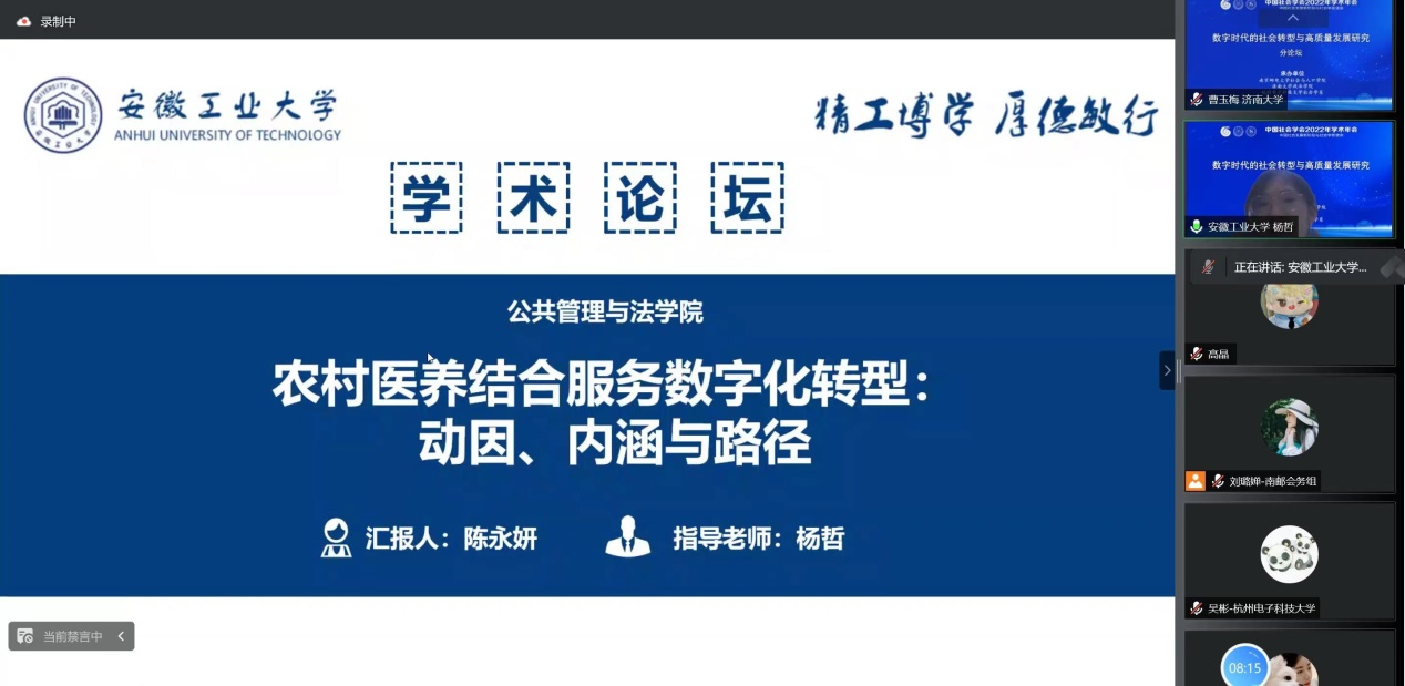 我院师生杨哲、陈永妍、王佩佩提交论文:农村医养结合服务数字化转型:动因、内涵与路径,入选该分论坛,陈永妍在该分论坛汇报,并于汇报结束,就汇报内容与会专家进行了友好的学术交流。