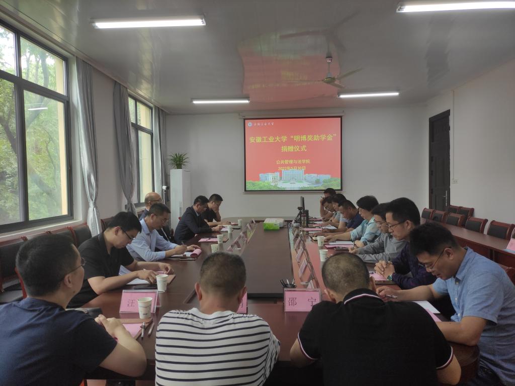 5月30日下午,安徽工业大学“明博奖助学金”捐赠仪式在我院会议室举行。副校长、校教育发展基金会理事长顾明言,安徽明博律师事务所高级合伙人、马鞍山市律师协会会长陈熙平,安徽明博律师事务所管理委员会执行主任李阳、党支部书记徐文东、费介华律师、蒋春龙律师出席捐赠仪式,学校校友工作处(教育发展基金会秘书处)处长甘亚,公法学院领导班子成员、各系室主任、团委书记参加了捐赠仪式。捐赠仪式由院长徐济益主持。