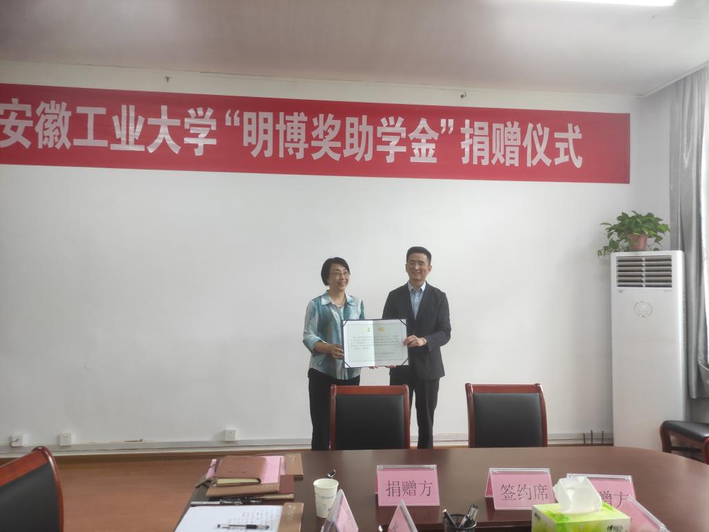 捐赠仪式上,安徽明博律师事务所管理委员会执行主任李阳、校友工作处(教育发展基金会秘书处)处长甘亚代表捐赠方和受赠方签订了捐赠协议,顾明言代表学校教育发展基金会向安徽明博律师事务所颁发了捐赠证书。