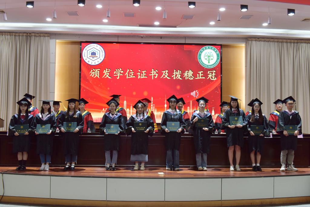 学位授予仪式上,在主席台就座的领导老师为2023届毕业生扶苏正冠,颁发毕业证书、学位证书,并合影留念。