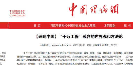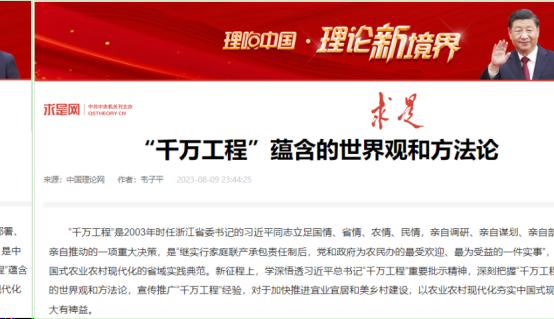 求是网链接:“千万工程”蕴含的世界观和方法论http://www.qstheory.cn/2023-08/09/c_1129795542.htm