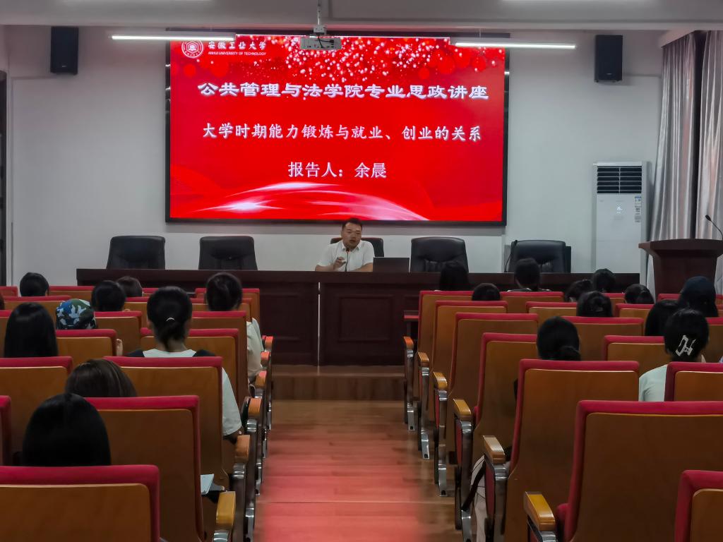 公共管理与法学院行政管理系发挥课程育人、探索创新专业思政建设方法路径。我院在2023年9月19日开展以“大学时期能力锻炼与就业、创业的关系”为主题的专业思政讲座。本次讲座由问延安老师主持,余晨学长主讲。
