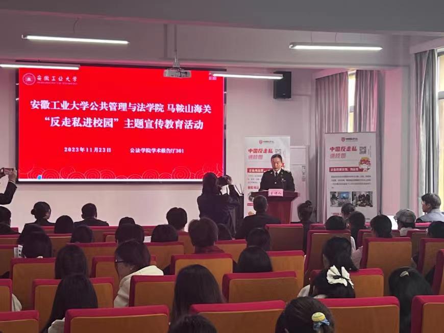为了引导在校大学生学会精准识别、坚决避免被违法犯罪分子引诱和利用,自觉防范和抵制走私行为,打击离岛免税“套代购”走私违法犯罪活动,11月23日下午,公共管理与法学院、马鞍山海关在公法楼学术会议中心联合举办“反走私进校园”主题宣传教育活动,守护“无私”的青春。马鞍山海关副关长吴钧、公法学院团委负责人、公法学院师生100余人出席活动。本次活动由公共管理与法学院党委副书记、副院长周浩然主持。