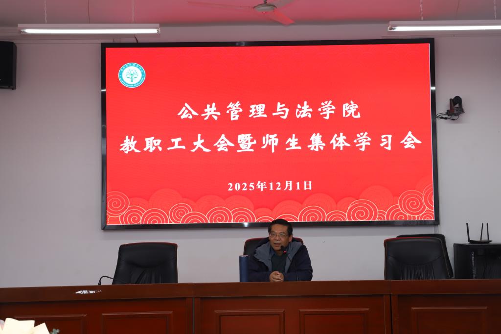 12月1日,公共管理与法学院召开教职工大会暨师生集体学习会。科研院副院长吴金南应邀出席会议,学院全体教职工和党员学生代表参加了会议。会议由院党委书记胡正友主持。