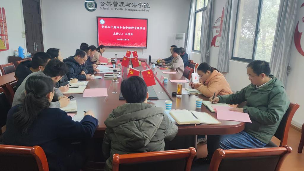 张世宏就党的二十届四中全会精神开展了进一步宣讲。他在会议讲话中,对公法学院党委理论学习中心组的学习总体情况给予充分肯定,认为学院党委高度重视中心组学习工作,工作扎实,形式多样,效果良好;对学院党委提出四点要求,一要强化政治理论学习,提高政治站位,持续深入学习贯彻党的二十届四中全会精神,切实将思想和行动统一到习近平总书记重要讲话精神和全会部署上来,要结合学院的特点,开展专题理论研究,形成高质量的研究成果,切实把学习成果转化为“十五五”时期推动学院高质量发展的实际成效;二要加强学科建设工作,结合当前安徽省高校公共管理学科建设的实际情况及地方经济发展需求,全方位分析、精准决策,按照学校的统一部署,整合优势资源,积极谋划推进博士点申报工作;三要加强人才培养力度,要始终把人才培养作为根本任务和首要职责,要从促进学生全面发展出发,打造具有公法学院特色的学生培养工作体系,积极开展校地合作,充分发挥校友资源,增强社会服务影响力;四要加强巡视巡察整改成果运用,充分认识巡视巡察作为推动改革、促进发展的利器作用,在人才培养、学科建设、社会服务上持续发力,为推动学校学院各项事业高质量发展贡献力量。